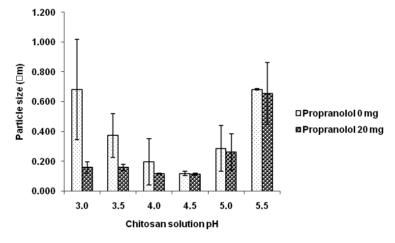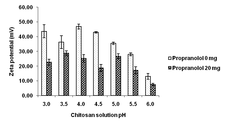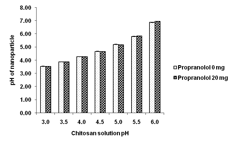 To optimize the nanoparticle formulations, the characteristic properties of nanoparticles should be determined. In this study, we characterized propranolol-loaded chitosan nanoparticles in terms of pH, zeta potential, and nanoparticle size. Additionally, the effects of altering the chitosan solution pH on the nanoparticle properties were also evaluated.