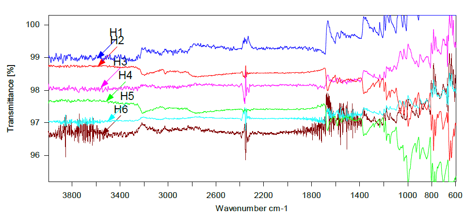 Fig. 1(B): Overlay Spectra of HHC with all excipients, (H1 = Pure HHC, H2 = HHC+MCC PH102, H3 = HHC+Tablattose, H4 = HHC+SSG, H5 = HHC+Ac-Di-Sol®, H6 = HHC+CCS)