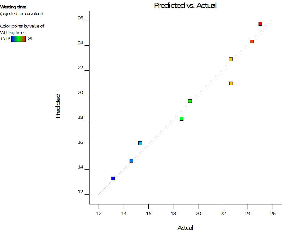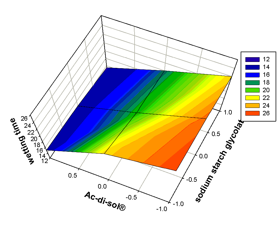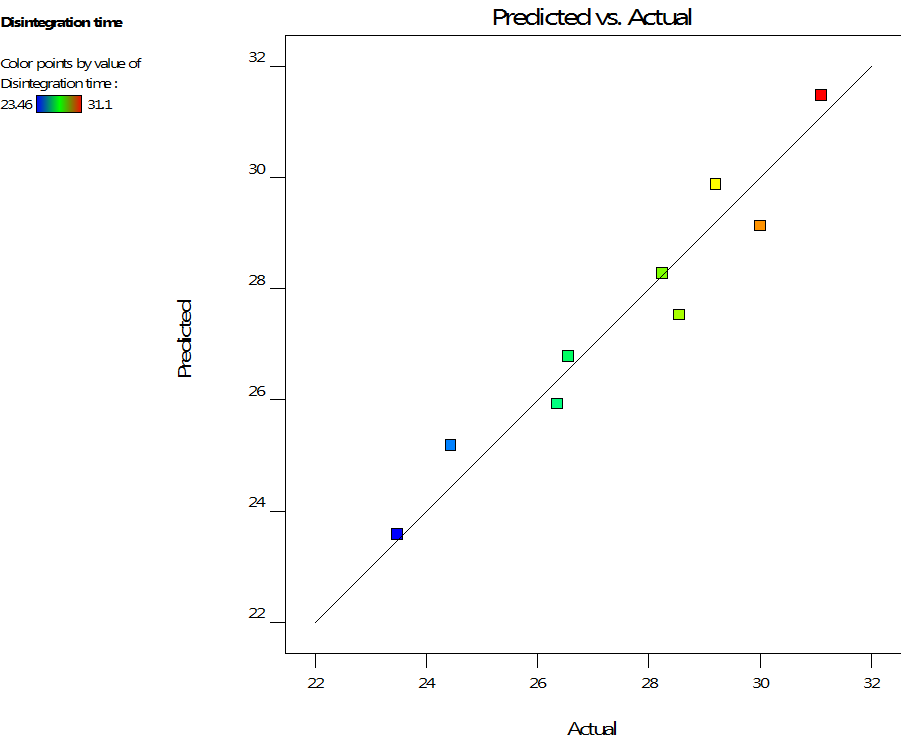 Based on the analysis of variance (ANOVA) the result showed that the developed linear model was highly significant, as was evident from a very low probability value 0.005. The value of R2 was found to be 0.987. The plot of observed WT versus predicted WT (fig. 2B) shows a straight line. Therefore, it may be concluded that the equation has good predictive ability. From the 3D plot (fig. 2A) and regression coefficient values of factors, it was concluded that when the amount of SSG and amount of ac-di-sol® were increased WT was decreased. Due to the higher hydration capacity of ac-di-sol® it gives a faster WT compared to the SSG. For WT, the significance levels of the coefficients b11, b22, and b12 were found to be P= 0.926, 0.323and 0.426, respectively, so they were omitted from the full model to generate a reduced model. The reduced or the refined model for WT,