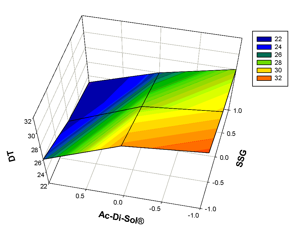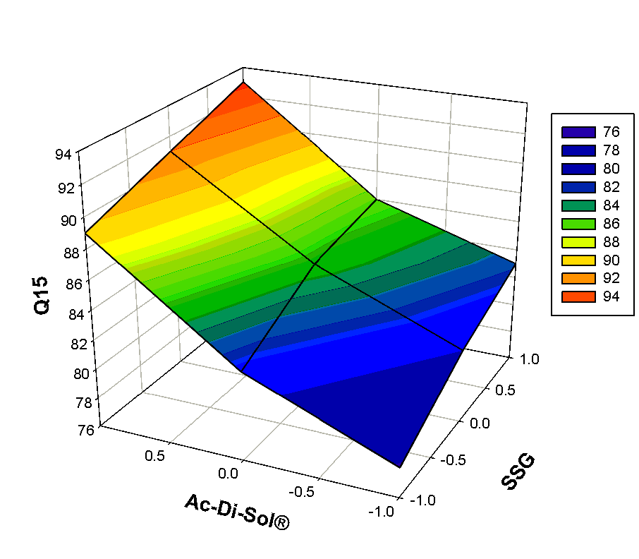 | Batch code | SSG *(X1) | Ac-di-sol® (X2) | WT (S) (Y1) | DT (S) (Y2) | Q15 (Y3) |