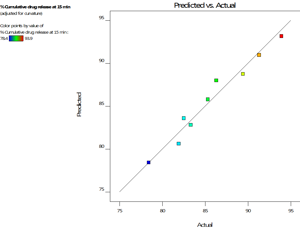 Based on the analysis of variance (ANOVA) the result showed that the developed linear model was highly significant, as was evident from a very low probability value<0.0001. The value of R2 was found to be 0.998. The plot of observed Q15 versus predicted Q15 (fig. 4B) shows a straight line. Therefore, it may be concluded that the equation has good predictive ability. From the 3D plot (fig. 4A) and the regression coefficient values of factors, it was concluded that when the amount of SSG and amount of ac-di-sol® were increased that time, Q15 was increased. The results also indicated that ac-di-sol® was given a more significant effect on Q15. For Q15, the significance levels of the coefficients b11 and b12 were found to be P= 0.154 and 0.272, respectively, so they were omitted from the full model to generate a reduced model. The coefficients b1, b2 and b22 were found to be significant at P<0.05; hence, it was retained in the reduced model. The reduced or the refined model for % cumulative drug release,