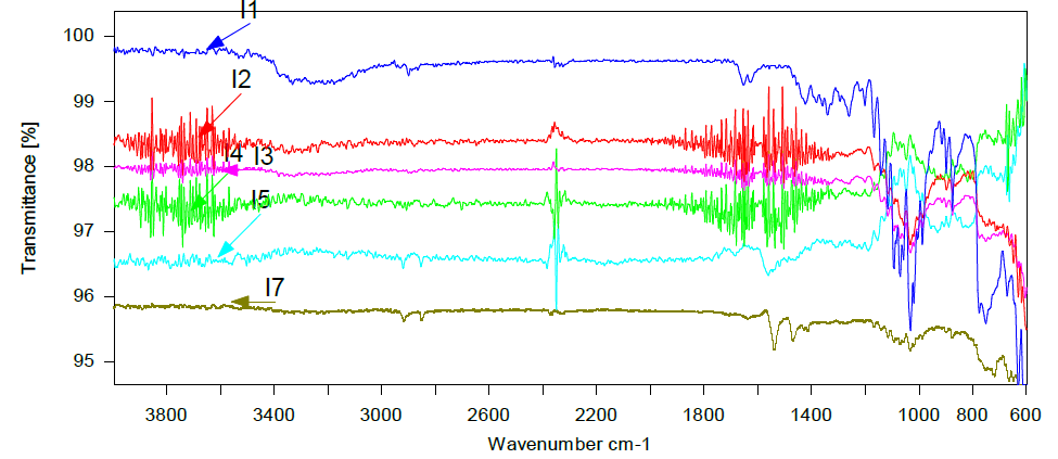 Fig. 1(B): Overlay spectra of ISDNwith all excipients, (I1 = ISDN, I2 = ISDN+MCCPH102, I3 = ISDN+HPMC K100M, I4 = ISDN+polyoxtm WSR303, I4 = ISDN+HPMC K15M, I7 = ISDN+Magnesium Stearate)