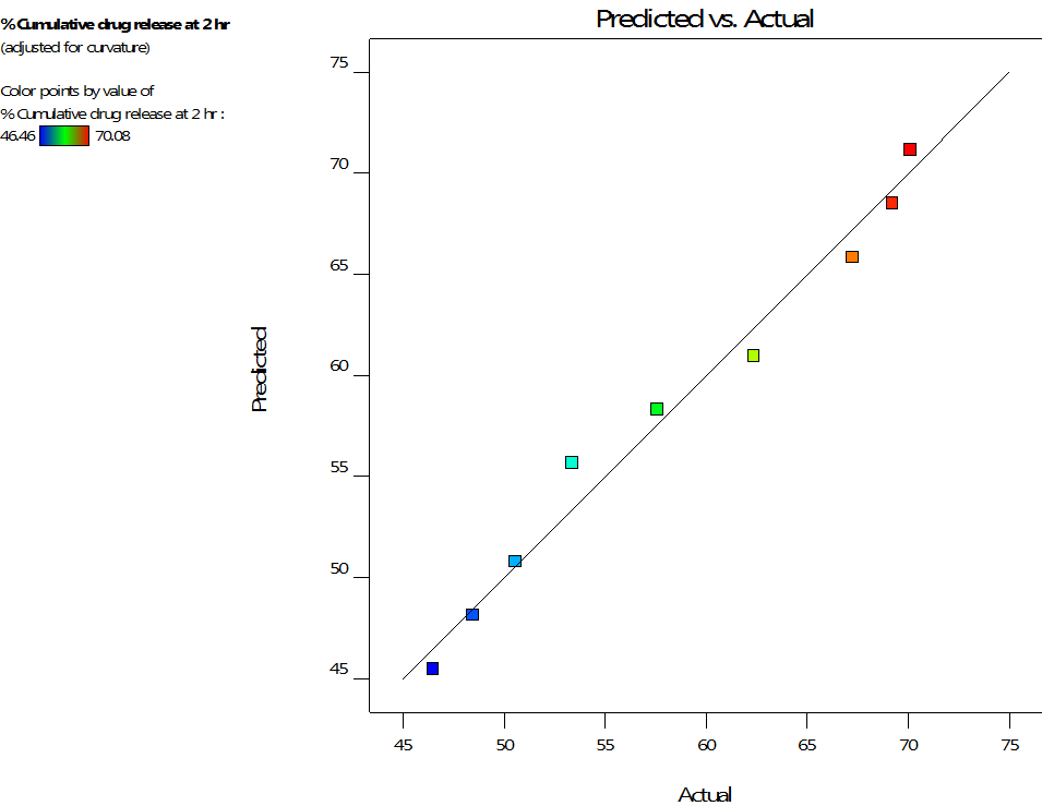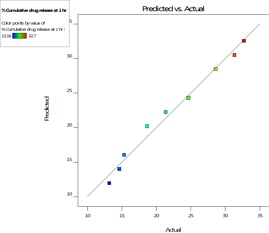 In this analysis, Q1 ranges were observed between 13.16±0.85% to 32.7±2.67 %. Based on the analysis of variance (ANOVA) the result showed that the developed linear model was highly significant, as was evident from a very low probability value 0.002. The value of R2 was found to be 0.993. The plot of the observed value of Q1 versus the predicted value of Q1 (fig. 3B) shows a straight line. Therefore, it concluded that the equation has good predictive ability. From the 3D plot (fig. 3A) and regression coefficient values of factors, it was concluded that when the amount of polymer was increased, drug releases was decrease. The polyether chains of polyoxtmWSR303 can form strong hydrogen bonds with water; polyoxtmWSR303 upon exposure to water or gastric juices, they hydrate and swell rapidly to form hydrogels. Therefore, polyoxtm WSR 303 was given a more significant effect on drug releases. Interaction and nonlinearity was not observed. For Q1, the significance levels of the coefficients b11, b22, and b12 were found to be P= 0.756, 0.232, and 0.417, respectively, so they were omitted from the full model to generate a reduced model. The coefficients b1, and b2 were found to be significant at P<0.05; hence, it was retained in the reduced model. The reduced model for Q1 Q1 = 21.717-(2.042 * X1)-(8.255 * X2)