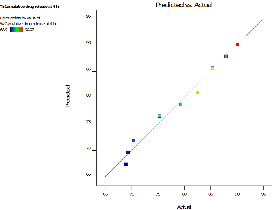In this analysis, the Q4 ranges were observed between 68.90±1.97% to 90.70±1.81%. The value of R2 was found to be 0.985. ANOVA analysis indicates that the developed linear model was significant, and it shows a very low probability value of 0.004. The plot of the observed value of Q4 versus the predicted value of Q4 (fig. 4B) shows a straight line. From the 3D plot (fig. 4A) and the regression coefficient values of factors, it was concluded that when Polyoxtm WSR303 amount was increased Q4 more decrease compared to the HPMC K100M. It was found that higher polymeric content in the matrix decreased the release rate of the drug. Interaction and nonlinearity was not observed. For Q4, the significance levels of the coefficients b11, b22, and b12 were found to be P= 0.920, 0.704, and 0.324, respectively, so they were omitted from the full model to generate a reduced model [22]. The coefficients b1 ,and b2 were found to be significant at P<0.05; hence, it was retained in the reduced model. The reduced model for Q4 Q4 = 79.143-(2.248 * X1)-(9.090 * X2)