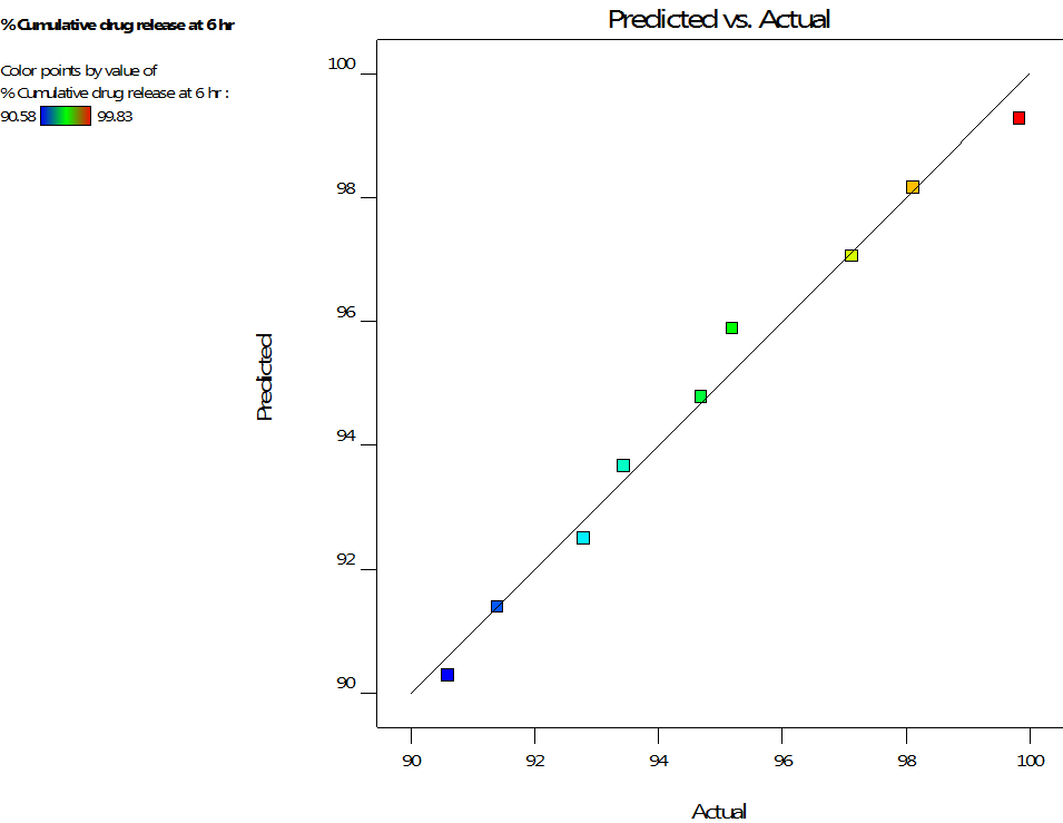 In this analysis, the Q6 ranges were observed between 90.58±1.34% to 99.83±1.12 %. Based on the analysis of variance (ANOVA) the result showed that the developed linear model was highly significant, as was evident from a very low probability value 0.001. The value of R2 was found to be 0.995. The plot of the observed value of Q6 versus the predicted value of Q6 (fig. 5B) shows a straight line. Therefore, it concluded that the equation has good predictive ability. Interaction and nonlinearity was not observed. From the 3D plot (fig. 5A) and regression coefficient values of factors, it was concluded that when the amount of polymer was increased, drug releases was decreased. The results also indicated that Polyoxtm WSR 303 was given a more significant effect on drug releases. For Q6, the significance levels of the coefficients b11, b22, and b12 were found to be P= 0.730, 0.126 and 0.530 respectively, so they were omitted from the full model to generate a reduced model. The coefficients b1, and b2 were found to be significant at P<0.05; hence, it was retained in the reduced model