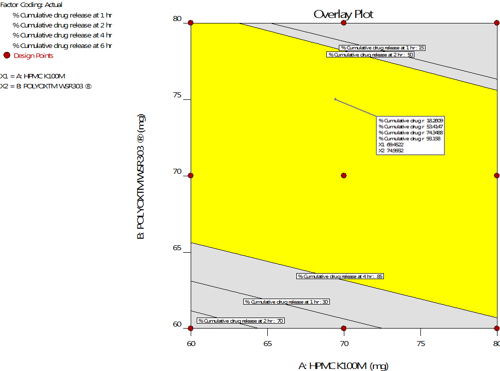Methods: Drug excipients compatibility study was carried out by FT-IR and a preliminary study was conducted for screening of polymer. The amount of HPMC K100M (X1) and the amount of Polyoxtm WSR303 (X2) were chosen as independent variables in 32full factorial designs. While % cumulative drug releases at 1 h (Q1) (Y1), % cumulative drug release at 2 h (Q2) (Y2), % cumulative drug release at 4 h (Q4) (Y3) and % cumulative drug release at 6 h (Q6) (Y4), were taken as dependent variables and statistically evaluation by using sigma plot 13.0. In the present study, according to the U. S. P. 2007 the following constraints were used for the selection of an optimized batch: Q1=15% to 30%, Q2=50% to 70%, Q4=65% to 85% and Q6>75%. To validate the evolved mathematical models, a checkpoint batch was selected from its desirability value.