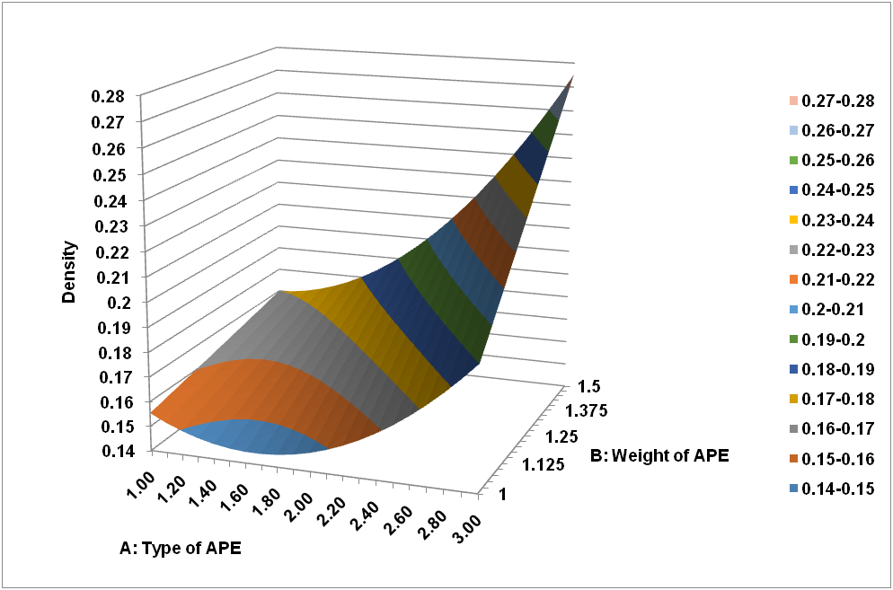 Fig. 1: Interaction APE type and weight of APE on the density of aerogel, APE: Arenga pinnata endosperm