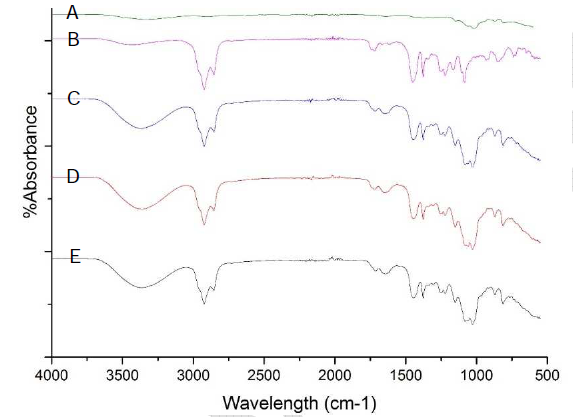Fig. 4: Spectra FT-IR of (A) aerogel; (B) vitamin E; (C) aerogel from APE type 1+vitamin E; (D) aerogel from APE type 2+vitamin E; and (E) aerogel from APE type 3+vitamin E, APE: Arenga pinnata endosperm