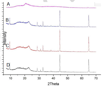 Fig. 6: X-RD spectra of (A) aerogel from APE type 2; (B) aerogel from APE type 1+vitamin E; (C) aerogel from APE type 2+vitamin E; and (D) aerogel from APE type 3+vitamin E, APE: Arenga pinnata endosperm