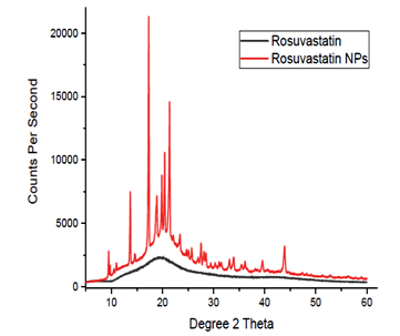 Drug crystallanity peaks were also detectable in the formulation. Compared with the PXRD patterns of pure rosuvastatin calcium and other formulation, the PXRD patterns of pure drug rosuvastatin calcium has the highest peak (2946) at 2θ range of 24.7, other peaks were (2385) at 2θ range of 20.1, (2294) at 2θ range of 1808, (2094) at 2θ range of 17.9, (1869) at 2θ range of 16.9 and (1599) at 2θ range of 15.9. While RF4 batch formulation has the highest peak (2825) at 2θ range of 9.47, other peaks were (7510) at 2θ range of 13.69, (21329) at 2θ range of 17.28, (10610) at 2θ range of 20.41, (14607) at 2θ range of 21.37,(4157) at 2θ range of 23.42, (3470) at 2θ range of 27.5, (3216) at 2θ range of 34.0, and (2006) at 2θ range of 43.8 indicating the amorphous nature of the drug in the formulation. These results confirm that rosuvastatin calcium is present as a crystalline material. The overlain spectra of rosuvastatin calcium and RF4 batch were shown in fig. 2.