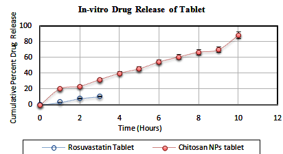 Fig. 7: Comparative in vitro drug release profile of rosuvastatin calcium-chitosan NPs tablet and pure drug tablet