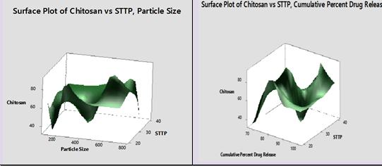 The effect of independent variables chitosan and STPP was analyzed by response surface plots using Minitab software 17. Fig. 8 and 9 shows responses for particles size (Y1) and % cumulative drug release (Y2) by the effects of independent variables. Observed coefficient values for the drug-loaded nanoparticles are represented in Eq. (5) and Eq. (6) [24].