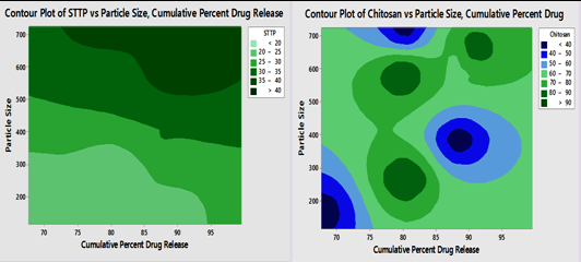 The effect of the particle size and chitosan was thoroughly proven by using full factorial design. From the above-generated surface response plots illustrated that as the concentration of chitosan increases, the value of the dependent variable, particle size increases and as the concentration of sodium tripolyphosphate increases the value of the dependent variable, particle size also increases. Similarly the response surface plots for % drug release shows negative effects of independent variable, chitosan concentration increases the % drug release was decreased and as the concentration of sodium tripolyphosphate increase the % drug release was also decreased. The best was selected based on the statistical data supportive evaluation. In the graph, it can be seen that the polymer ratio of 1 has correlated with the highest percent cumulative drug release and also the lowest particle size. Contour plot further strengthens the evidence that indicates the various colored regions with percent cumulative drug release [23].