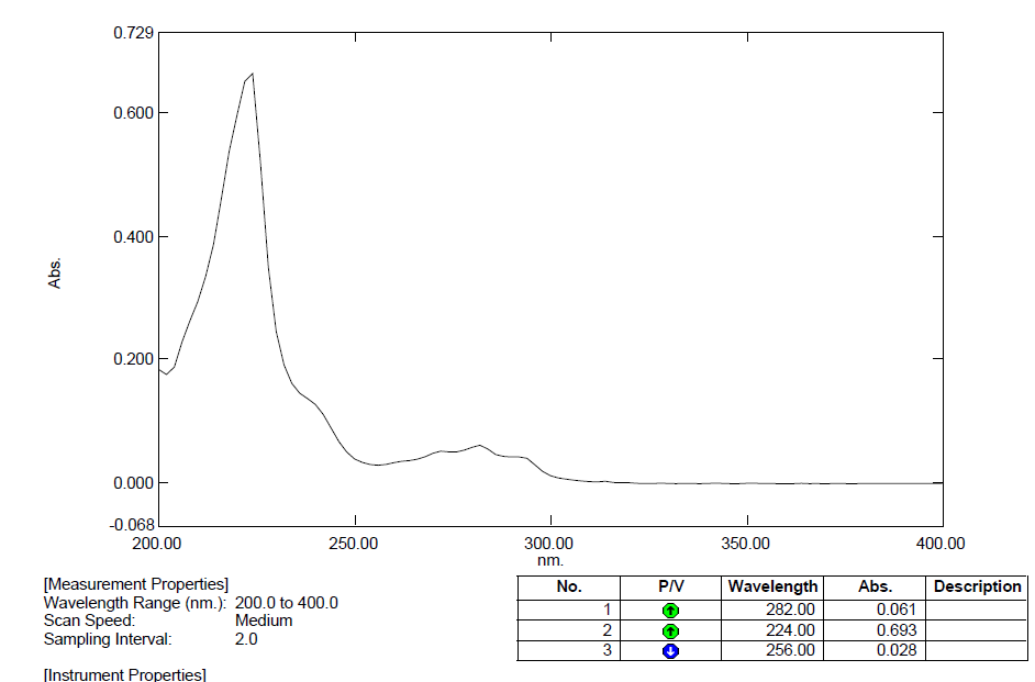 The UV Spectra of pure drug gets examined by UV spectrophotometer shimadzu. Stock solution of terbinafine HCL was made through dilute of 10 mg pure drug in 50 ml of methanol. After that, make the dilutions in the series 5-40 µg/ml with the methanol. Then the solutions of TER-HCL were examined through U. V. range at 224 nm with methanol as blank. Further UV curve was plotted and all outcomes were recorded and determined as well as [11].