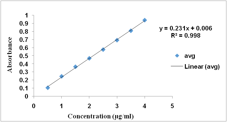 The calibration curve for terbinafine hydrochloride was obtained by using the 5 to 4 µg/ml concentration of terbinafine hydrochloride in methanol. The absorbance was measured at 224 nm. The calibration curve of terbinafine hydrochloride as shows in graph indicated the regression equation Y= 0.231x+0.006 and R2value 0.998, which shows good linearity as shown in fig. 2.