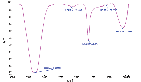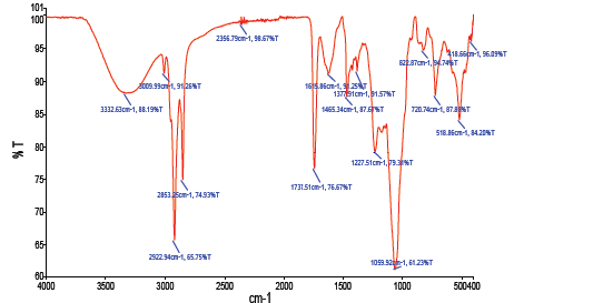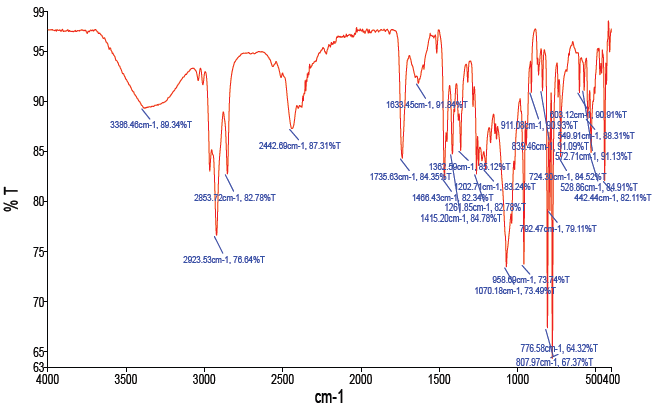 The FTIR spectra of soya lecithin were shown in the fig. 5. IR absorption peaks of soya lecithin at 3332.63 cm-1(C–H stretching band of long fatty acid chain). This observation confirmed the purity and integrity of the lecithin.