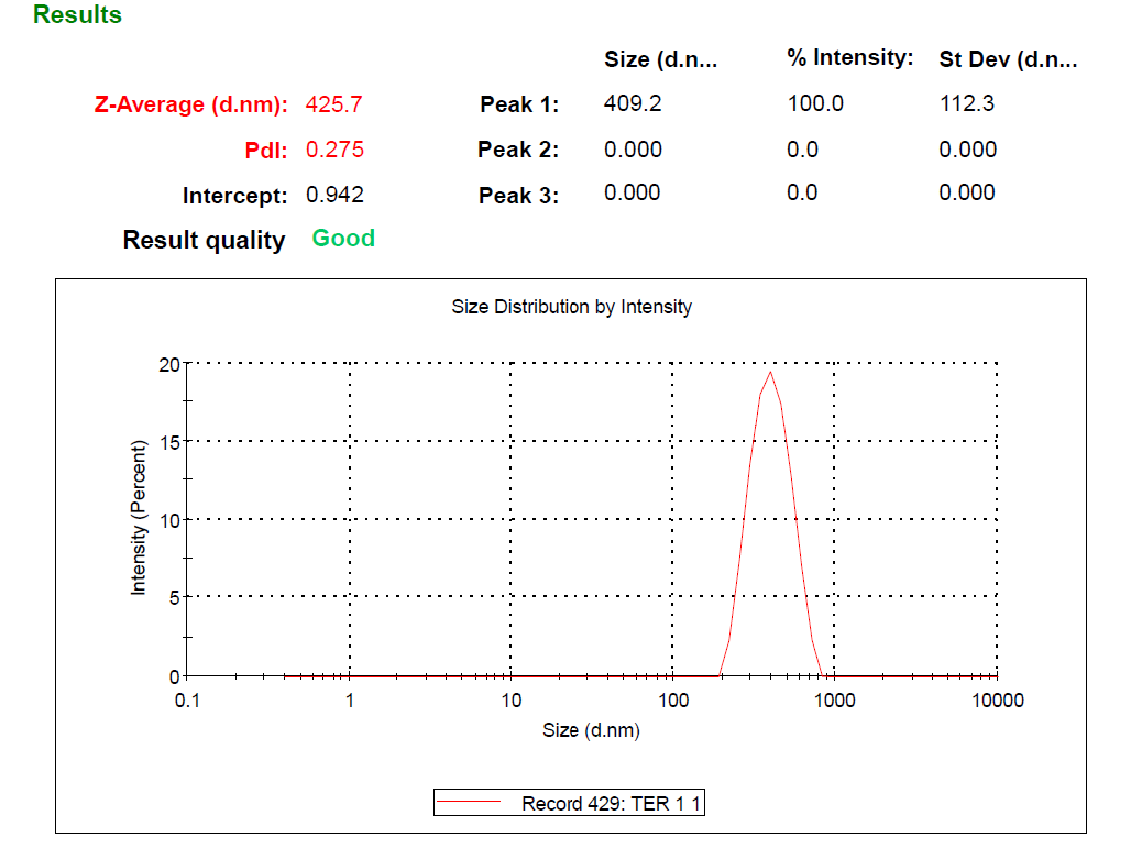 The Particle size with polydispersity index of formulation (F3) was 425±112.3 nm with PDI 0.275±0.000 in fig. 9. Hence, the particle size of formulation was showed the high loading entrapment efficiency of the phytosome.