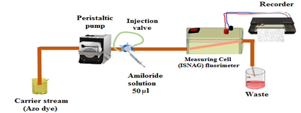 In the present work, a novel fluorometric method has been developed for the determination of Amiloride combined with a flow injection technique using a homemade ISNAG-fluorometer [27]. This method is based on using azo dye (2-(4-nitrophenyl)-N-(4-(phenyldiazenyl)-2H-chromen-4-amine) as fluorescence dye, then the constant fluorescence is quenched by amiloride. The fluorescence quenching was measured by ISNAG-fluorimeter.