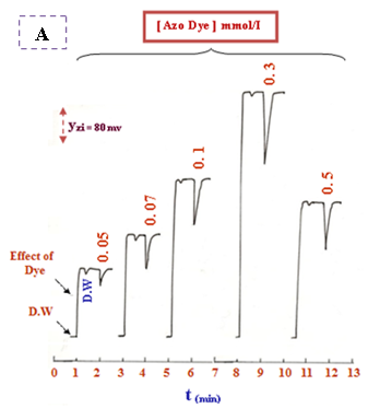 A set of 2H-chromene azo dye concentration ranging from 0.05-0.5 mmol/l were prepared as a carrier stream with a flow rate of 1.2 ml/min and 50 µl of 4 mmol/l of amiloride as an injected sample to study the effect of the amiloride solution on the quenching of continuous azo dye fluorescence. The profile shows in the fig. 5. A, B. Table 1 summed up the obtained results, which observed that an increase in fluorescence of azo dye with an increase of azo dye concentration, at the same time, increased quenching effect by amiloride solution. The optimum concentration of azo dye that gave maximum fluorescence, quenching of continuous fluorescence by amiloride, and minimum effect of blank response is 0.3 mmol/l. A higher concentration of azo dye does not include in this study due to the self-quenching [30].