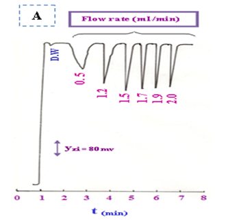 Employing the optimum concentration of azo dye (0.3 mmol/l) and a selected concentration 4 mmol/lof amiloride, 50 µl sample volume, and open valve mode with variable flow rate (0.5-2.0 ml/min) for the carrier stream (2H-chromene azo dye solution). Fig. 6A shows a kind of response profile that was obtained while all results were sorted in table 2. It was can be observed that at a low flow rate, there is an expansion in dispersion and dilution effect due to the distribution of segment (i. e; amiloride) on a larger area [31]. But at the high flow rate result in an increase in peak height, the peak base width decrease, lower at analysis time, and minimize the dilution effect and obtained sharp edges responses [32]. Therefore, the best flow rate was 1.5 ml/min (fig. 6B).