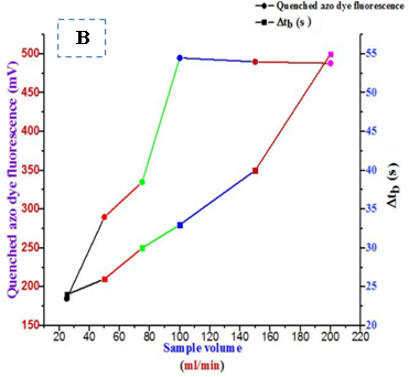 Fig. 7: Effect of variable sample volume on: (A) Profile using quenched fluorescence by amiloride, (B) Quenching of fluorescence response described as the average peak heights (mV) and ∆tB