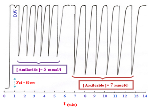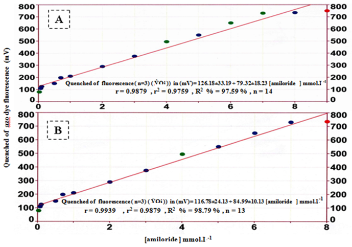 Quenched of fluorescence (n=3 (ŶQi)) in (mV) = 116.78±24.13+84.99±10.13 [amiloride] mmol. l-1 While for working range at n= 14 is