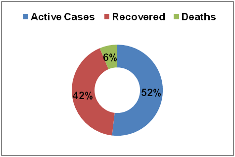 A novel CoV has become prominent in late 2019 and continued till today. It may impose health threat globally and has become influential in giving the evolved epidemic in China and other areas. Currently, health care professionals and workers are putting efforts worldwide to control the disease outbreaks caused by the novel CoV (originally named 2019-nCoV). It was first identified in Wuhan City, Hubei Province, China, on December 12th 2019 [2-4]. On February 11th 2020, the World Health Organization (WHO) announced the official designation for this current CoV associated disease to be “COVID-19”. Corona means crown, the well-known virus acquired this name from a sharp (spiny) crown of glycoproteins on its surface [5, 6]. The various mammals and birds were typically infected by this RNA virus. The primary cluster of patients were found to be connected with the Wuhan’s huanan South China seafood market [7, 8]. CoVs belong to the family Coronaviridae (subfamily Coronavirinae), the members of which infect a broad range of hosts, producing symptoms and diseases ranging from a common cold to severe and ultimately fatal illnesses such as SARS, MERS, and as of present, COVID-19 breakthrough to respiratory diseases such as ARDS (acute respiratory distress syndrome), pneumonia and multi-organ failure. Countless people did not show any symptoms [9, 10]. Till now, globally 55,00,679 total cases of COVID-19 were reported, out of which 28,51,888 (52%) were found to be active, 3,46,721 (6%) patients were died and 23,02,070 (42%) were recovered as depicted in fig. 2. Favourably, infants have been intermittently affected without any death loss. COVID-19 has represented a high negative impact on the economy of China as well as a few other nations. The lessons from such earlier threats of SARS, MERS and of the current COVID-19 situations need to be kept in mind for active strategy planning to counter such emerging and zoonotic pathogens that could pose pandemic threats while putting human lives at bay [11, 12].