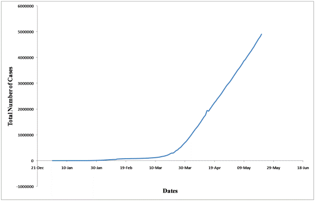 Besides affecting China (mainly), SARS-CoV-2 (COVID-19) has now spread in the whole world. Out of cumulative 28,51,888 active cases, 3,46,721 human deaths and 23,02,070 recovered have been documented as of May 24, 2020. Currently, the virus has been spread to more than 200 countries and territories with a number of confirmed cases. There are top 10 countries which are highly affected by stage-IV (epidemic) namely USA (16,86,436), Brazil (3,65,213), Russia (3,44,481), Spain (2,82,852), UK (2,59,559), Italy (2,29,858), France (1,82,584), Germany (1,80,328), Turkey (1,56,827) and India (1,38,917). Fig. 4 depicts the worldwide spread of novel coronavirus. In spite of various strategies issued by numerous health agencies to combat the transmission of COVID-19, the growing number of infected patients globally remains the matter of concern as shown in fig. 5.