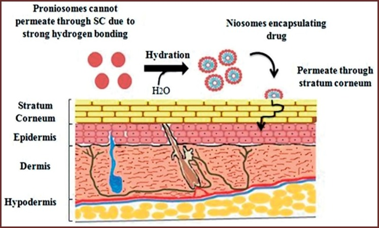 The proniosomal delivery has attracted the transdermal route for the potential delivery of drugs because both nonionic surfactants and phospholipids themselves act as penetration enhancers. The non-ionic surfactant and cholesterol ratio can alter both the release characteristics and the encapsulation efficiency of the entrapped drugs. It also improves the release and permeation of active agents via skin and also governs the rate of the drug release mechanism. After the application of proniosomes to the skin, they get hydrated to form niosome vesicles, and a high thermodynamic activity gradient develops at the contact, which increases the permeability of the drug. Thereby, the drug penetrates the skin layers and it can be absorbed into systemic circulation via capillaries. The mechanism of permeation was shown in fig. 2. The Gels became more familiar because of ease of applicability, good percutaneous permeation, controlled drug release characteristics than other semi-solid preparations. Hence, proniosomes are commonly prepared in gel formulation [6, 7, 11].