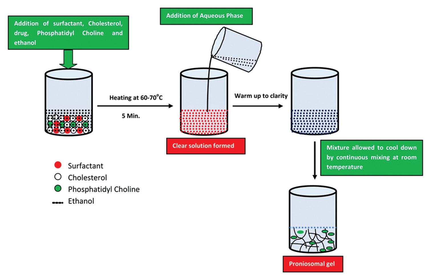 It was prepared by the Coacervation-phase separation method. In this method, the nonionic surfactants were weighed and put in a wide mouth glass vial with a tightly screwed cap. Then an accurate amount of drug, cholesterol, and lecithin was added to the glass vial. After mixing all these ingredients in a glass vial, ethanol was included and mixed up thoroughly. Heat the above solution until the cholesterol, lecithin, and drug were completely dissolved in surfactant until the appearance of a clear gel (Usually it takes about 20-25 min for soya lecithin to completely dissolve in surfactant). To this clear solution like gel, then add 0.1 % glycerol solution (it acts as an aqueous phase) and was gently heated until a clear solution (usually it takes about 10 min) obtained, later cooled down while mixing it with a glass rod at regular intervals. Finally, that results in the formation of nanoproniosomal gel [21-23]. The schematic representation of this method was shown in fig. 3. The formulation was shown in table 1.
