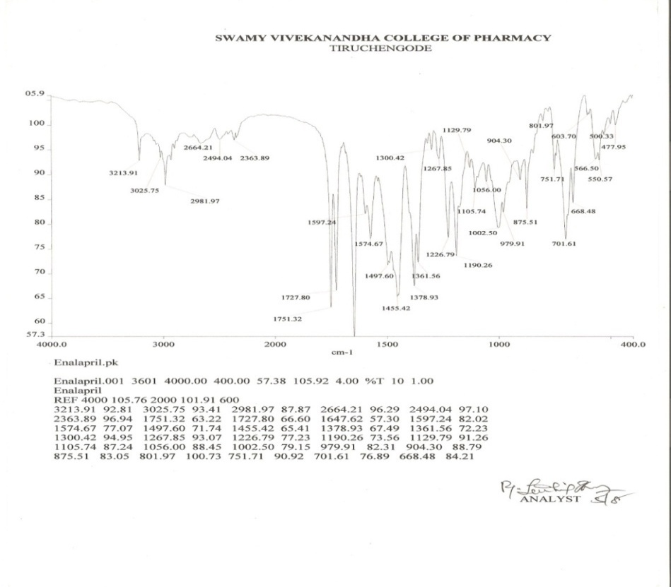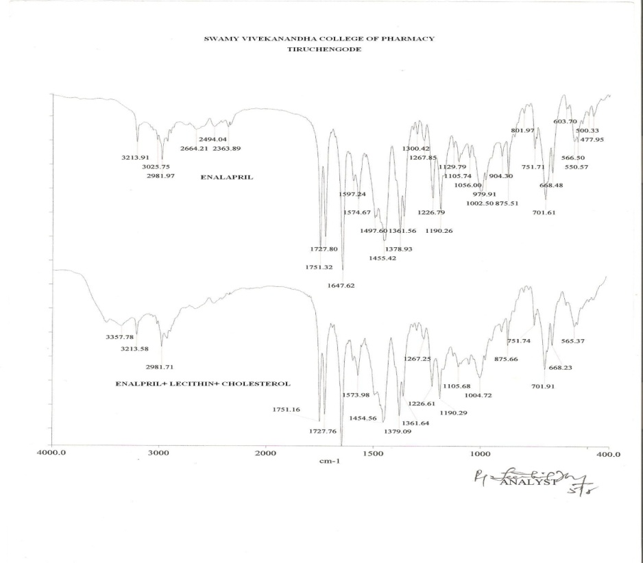 Fourier Transform-Infrared Spectroscopy (FT-IR Spectroscopy) was done to investigate and predict the physicochemical interaction between formulation components such as lecithin, cholesterol with drug substance. A small amount of sample was mounted on the sample handling stage and scanned in an FTIR spectrophotometer. The IR spectrum of the pure drug was compared with the physical mixtures of drug and excipients, and peak matching was carried out to determine the disappearance or appearance of peaks [18-20].