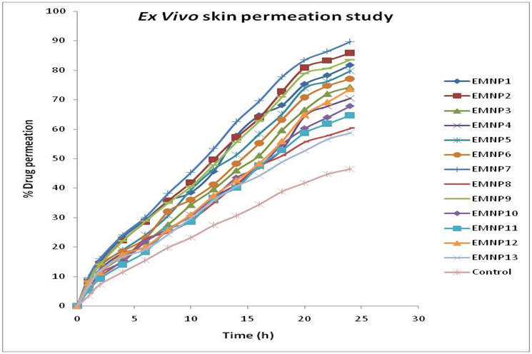 Results: Physical characterization was found to be within acceptable limits. The ex vivo skin permeation studies showed the cumulative permeation of 58.75 % to 89.72 % through the albino rat skin in 24 h for all the formulations, which indicate the zero-order drug permeation with diffusion, non-fickian release. Among all formulations, EMNP7 was selected as best formulation because it showed better characteristics than other formulations in several aspects like physicochemical characterization, ex vivo skin permeation studies, permeation kinetics, and other evaluation parameters. The skin irritation study revealed that there was no irritation after topical application and it was found to be safer to use. The In vivo antihypertensive study revealed that the formulation of EMNP7 was successful to regress the rat blood pressure (BP) to normal values in experimental hypertensive rats.
