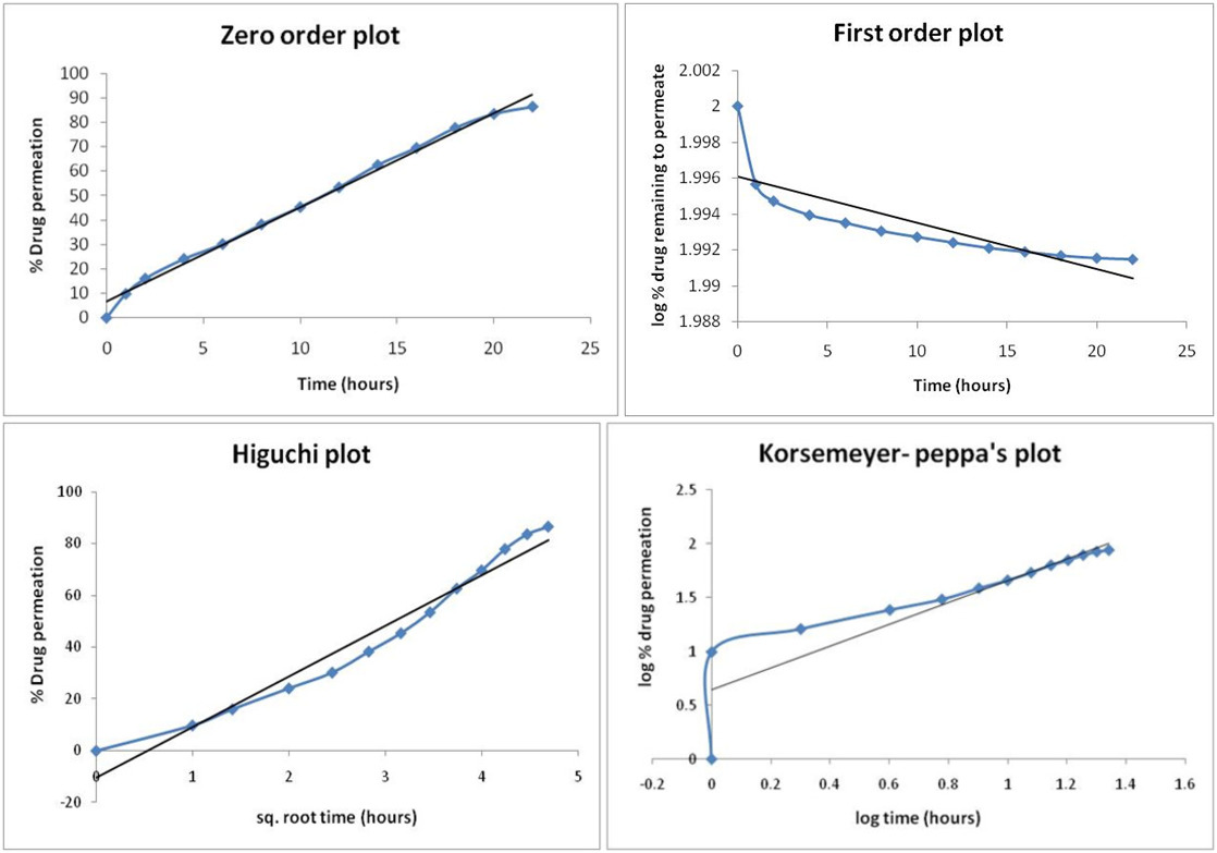 To determine the mode and mechanism of drug release, the data obtained from the ex vivo permeation profiles were fitted in various kinetic models such as zero-order kinetic model (cumulative % drug release versus time), first-order kinetic model (log cumulative of % drug remaining versus time), Higuchi's model (cumulative % drug release versus square root of time) and Korsmeyer-peppa’s model (log cumulative % drug release versus log time) [18, 19, 29].