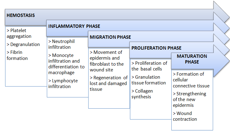 Wound healing is a highly complex physiological process involving the involvement of various cells and biochemical components. The entire healing process is accompanied by activation of several enzymatic pathways which ultimately help the tissue to heal [5]. The process involves regeneration and replacement of damaged tissues. The healing progresses through a series of interdependent and overlapping phases that help in replacement of lost tissue and re-establishment of tissue integrity. The different stages involved in wound healing are hemostasis, inflammation, migration, proliferation and maturation phase [3, 5, 7]. The events occurring during these phases are depicted in fig. 2.