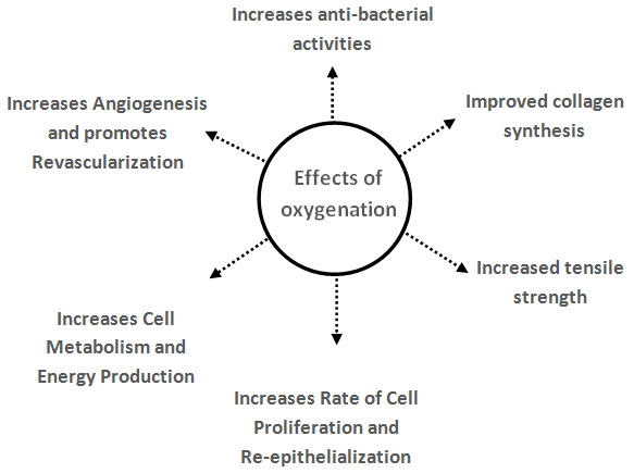 Oxygen is critical for all stages of wound healing. Healing tissue also has an increased energy demand. The mitochondrial enzyme cytochrome oxidase requires oxygen for energy metabolism i.e., production of high-energy phosphates for various cellular functions. The process of collagen synthesis involves the production of procollagen, followed by collagen maturation. Oxygen is involved in the hydroxylation of proline and lysine into procollagen. The phase of angiogenesis is initiated by hypoxia. But reports suggest that the administration of oxygen can accelerate and sustain the growth of blood vessels. Oxygen also exhibits antimicrobial activity. Leukocytic NADPH oxidase converts oxygen to a superoxide ion which kills bacteria [10-13]. Overall, the effects of oxygenation on tissue healing are summarised in fig. 3.
