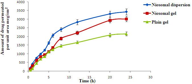 The in vitro release data thus obtained for optimized niosomal gel was fitted into different mathematical release models. The highest value of the correlation coefficient (R2) would be selected best-fit model for release. The results obtained are listed in table 3 and the advocated best-fit model for optimized gel was Higuchi matrix model where it showed the highest R2value of 0.945. Results confirm the sustained delivery of the drug from niosome for a prolonged period with a diffusion control pattern and found in the agreement with results obtained and reported by previous research studies [24]. Thus, considering the above outcome, the optimized niosomal gel was selected for ex-vivo permeation studies.