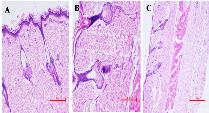Fig. 6: Histopathological cross-sections of rat skin stained with haematoxylin and eosin (A) untreated (control), (B) niosomal dispersion treated (C) optimized niosomal gel treated