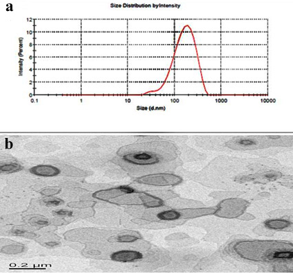To assess particle size distribution (fig. 3a) and morphological characteristics (fig. 3b) of niosomes, transmission electron microscopy was performed.