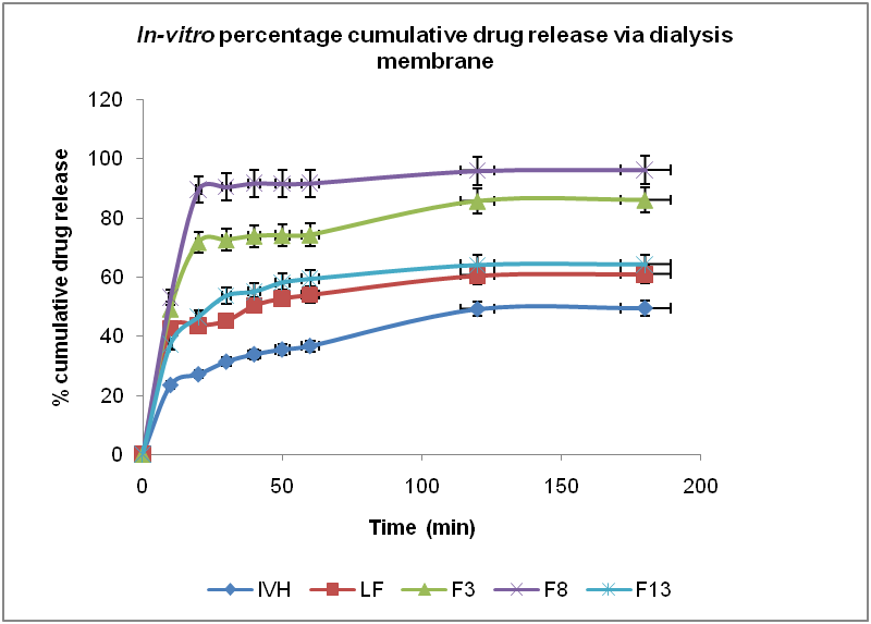 On the basis of maximum % EE, suitable vesicular size and maximum DI F8 was selected for this study. Treated cellophane membrane was tied on the mouth of dialysis tube (surface area 4.52 cm2) and diffusion conditions were maintained. 50 ml of phosphate buffer (pH 6.8) was used as receptor fluid at 37 °C at 100 rpm on magnetic stirrer. Each of 10 mg IVH-loaded TFs sample from selected formulation was placed on cellophane membrane and this assembly was touched onto dissolution medium surface. Samples were withdrawn (2 ml) at regular intervals of 10 min and replaced with same amount of phosphate buffer (pH 6.8). Same procedure was adopted for lLF and plain drug (IVH). The samples were suitably diluted with buffer solution up to 3 h and absorbance was noted at 286.0 nm using phosphate buffer (pH 6.8) as blank. The percentage drug released was determined as follows-