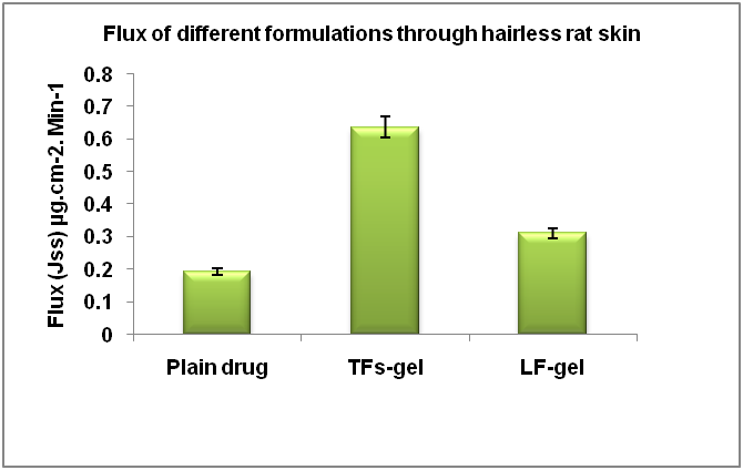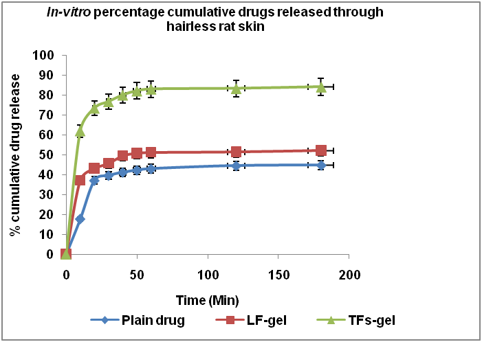 Drug release studies from gel is an important step during the development stages of new formulations for assuring that a drug carried by a vehicle is able to reach the skin surface at an adequate rate and in sufficient amounts. For this purpose, the release studies were performed over 48 h to be sure that the drug is released over a long period of time [15]. Male wistar rat (230g) procured from central animal house of RKDF University, Bhopal. The rat was kept under standard laboratory conditions at 25±2 °C and 55±5% relative humidity with a 12 h light/dark cycle. Rat was acclimatized for one week and placed in polypropylene cage with free access to standard laboratory diet and water. This study was conducted by following guidelines of the institutional animal ethics committee of college of pharmacy shri satya sai university of technology and medical sciences sehore, having approval number COPSSSUTMS/ANIL/19-07. The condition of the rat was monitored every day before performing the present study. Dorsal fur was removed from back portion of rat ear skin with mechanical hair clipper and depilatory cream was applied to remove small hair. The skin was immersed in distilled water maintained at 60 °C for 2 min. Fatty layers were removed and washed with saline and distilled water for use [16]. The permeation studies were carried out by using hairless rat skin. Prepared skin was tied on the mouth of dialysis tube (surface area 4.52 cm2). 50 ml phosphate buffer (pH 6.8) was used as receptor medium in a beaker on magnetic stirrer at 100 rpm at 37 °C. One gram of TFs-gel sample was placed on the rat skin and assembly was touched on the surface of dissolution medium. Sample (2 ml) were withdrawn at regular intervals of 10 min up to 4 h and replaced with same amount of buffer. These samples were diluted suitably with dilution medium. The percentage cumulative drug release was measured at 286.0 nm using UV spectrophotometer [17]. The steady state flux of IVH through rat skin was determined from the slope of the linear portion of the amount permeated per cm2 (Q) versus time graph. For comparison same procedure was adopted with LF-gel and plain drug sample. All determinations were carried out in triplicate and findings were represented as statistical evaluation.