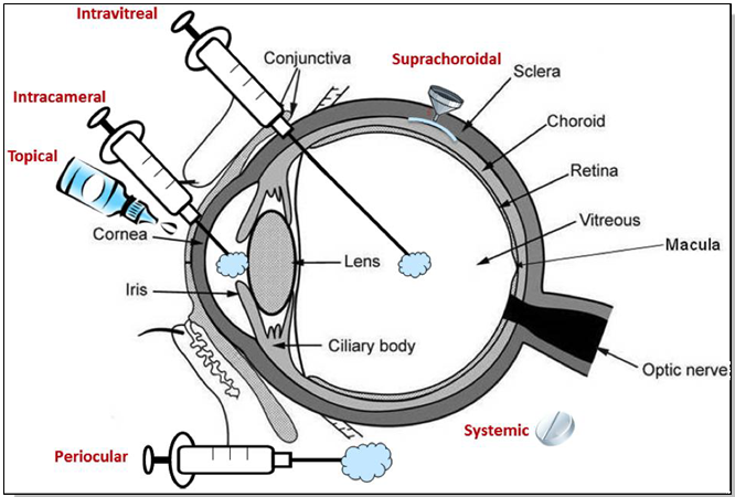 In this route, the medication is delivered through injections in the vitreous humor of the eye. This route of administration is used to cure a number of eye disorders; the delivery through this ocular route is shown in fig. 1.