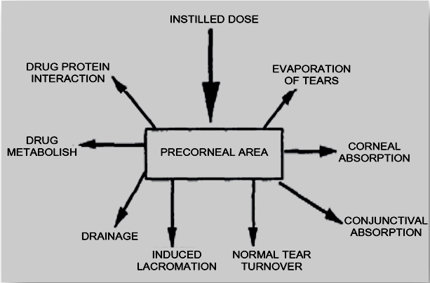 Topical formulations are mostly preferred over systemic formulations in the ocular delivery system because if any drug formulation is administered to eye, before reaching the anatomical barrier of the cornea, the drug molecule has to face the precorneal barriers, the tear film and conjunctiva, which come first in the pathway and slow the penetration of the active moiety in the eye. Precorneal loss factors are responsible for poor bioavailability of the drugs in most of the ocular formulations, as shown in fig. 2.
