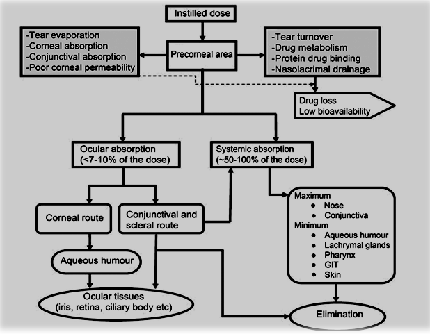 After using the dosage form of the drug in the ocular system, flow of lacrimal fluid wipes out a portion of the drug from its surface and its turnout rate is only about 1 μl/min, whereas, a major portion of the drug is wiped out through the nasolacrimal duct quickly within minutes. Other sources of drug removal include the systemic absorption of the drug, instead of being absorbed through the ocular route. Systemic absorption is mostly directed through the conjunctival sac to the local blood capillaries or takes place after the solution flows to the nasal cavity [9].