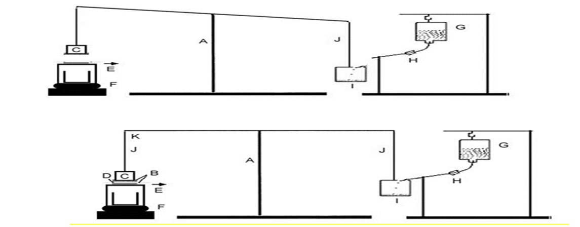 Fig. 1: Mucoadhesive-force-measuring device: (A) modified balance, (B) section of rabbit small intestine, (C) 100g weight, (D) gel film, (E) inverted beaker, (F) hot plate, (G) dropping bottle, (H) infusion apparatus, (I) Beaker, (J) thin steel wire, (K) balance bar