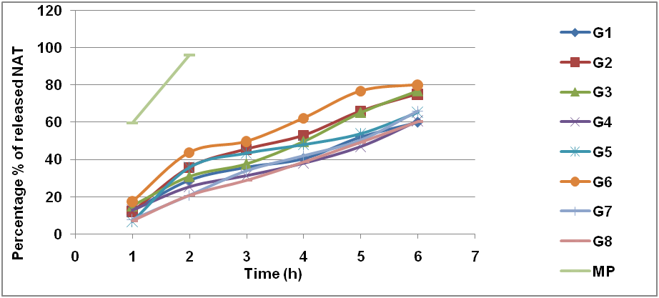 The in vitro release of NAT from different gel formulae versus MP is illustrated graphically in fig. 3. From the obtained results, it was clearly observed that the rate of NAT release from gels sustained up to 6 h compering with MP, which indicated that the NAT-SLN loaded gels were capable of controlling the release rate of NAT. There was an indirectly proportional relationship between the polymer concentrations and the percentage of NAT released from the gel form. When semi-solid formulations in a specific type of polymer at various concentrations were prepared, the active substance released from the formulations decreased as the polymer concentration increased. The density of chain structure, which had been observed in gel microstructure, increased at high polymer concentration and this restricted the active substance moving area resulting in decreasing the release of the active substance [37].