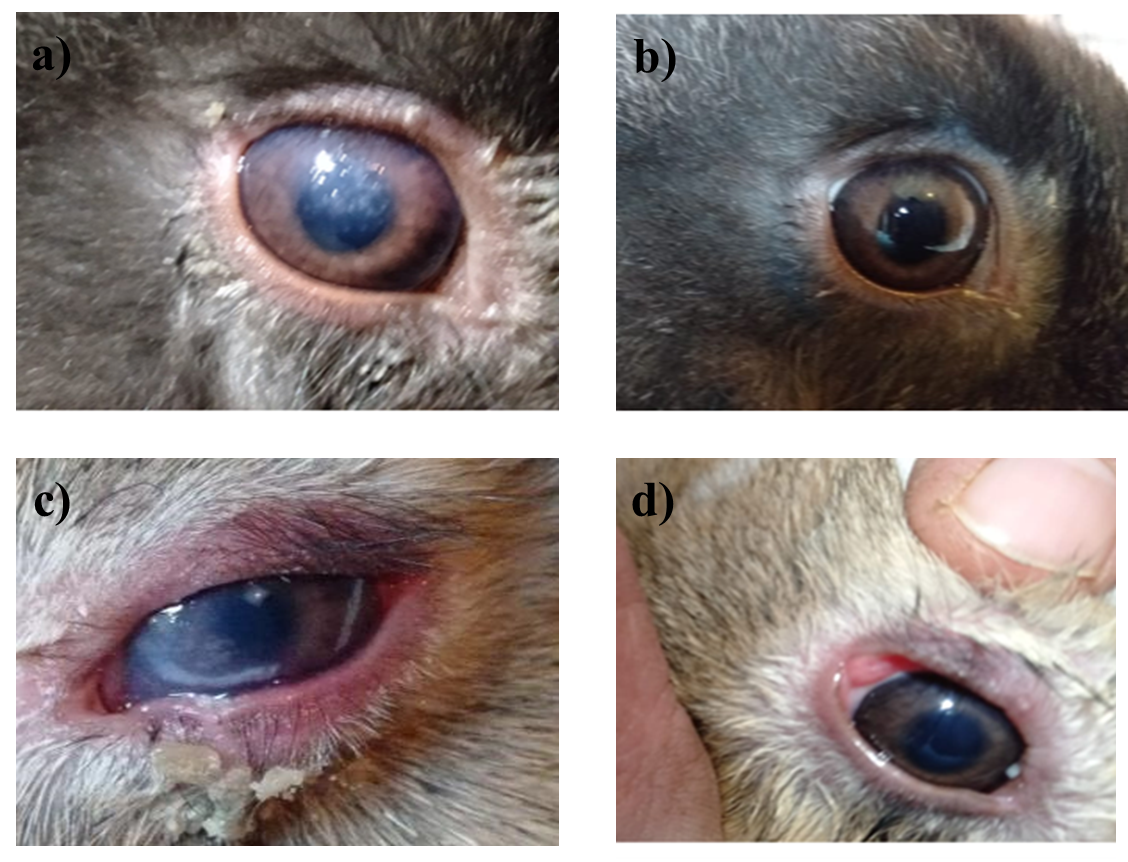 Fig. 4: a, c) 48h after rabbit’s cornea inoculation with Candida Albicans showing corneal opacity and hypopyon, b) Group, A after treatment with MP (in usual regimen) showing improvement of inflammation and corneal transparency, d,) Group B after treatment with G2 (every 8h) showing improvement of inflammation and corneal transparency