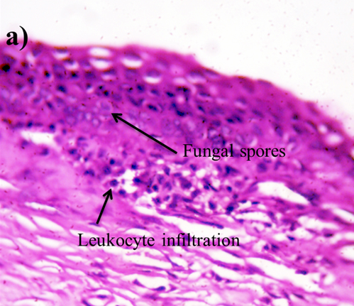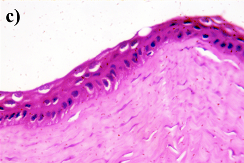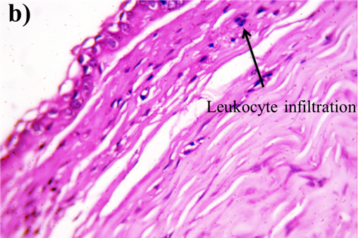 After 48h from Candida inoculation, the rabbits’ eyes suffered from loss of corneal transparency, deep stromal ulcer, surrounding stromal edema, and inflammation (fig. 4 a, c). G2 (NAT-loaded SLN ‘‘5% Pluronic acid and 1:1 mixed lipid’’ 4HPMC) was recommended for further in vivo evaluation. All rabbits in groups A and B assigned for formula MP as rapid release and G2 as sustained-release manner, respectively. The right eye of all rabbits received these forms responded better and showed improving of the corneal transparency, decreasing in size and depth of ulcer and stromal edema (fig. 4 b, d). These results were consistent with the findings of the histopathology of specimens taken from the cornea showed in fig. (5 a, b, c). Untreated control corneal specimen that received saline shows severe vascular changes and leukocyte infiltration with large number of fungal spores appears as a round faint vesicular body’s fig. 5a. Fig. 5b shows a corneal specimen of group A with mild hydropic changes and leukocyte infiltration with no fungal spores compared with the untreated control cornea. In fig. 5c, the corneal specimen of group B shows nearly normal histological structure with no leukocyte infiltration and absence of the fungal spores compared with untreated control cornea. Based on the clinical and histopathological findings, G2 (NAT-loaded SLN ‘‘5% Pluronic F127 and 1:1 mixed lipid’’ 4% HPMC) provided higher curing effect for fungal keratitis than MP in a controlled release manner up to 8h to reduce dosing frequency and improve the patient compliance.