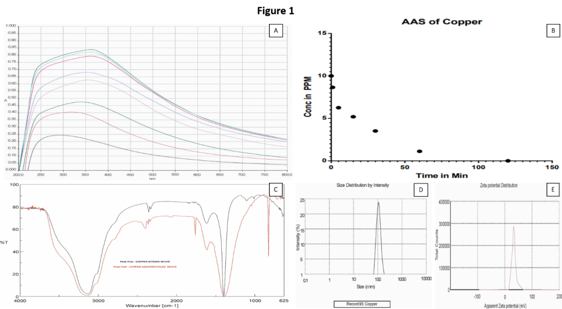 Fig. 1: (A) SPR of CNPs was studied by observing UV-Visible absorption spectra during the synthesis of CNPs. (B) AAS flame spectra of CNPs, show the conversion of ionic copper ions into CNPs. (C) FTIR spectra of copper nitrate and CNPs mother solution, indicating formation of ferric nitrate. (D) DLS spectra of CNPs indicating a hydrodynamic radius of less than 105±2. (E) Zeta potential of CNPs indicating surface charge 33.11±2 mV