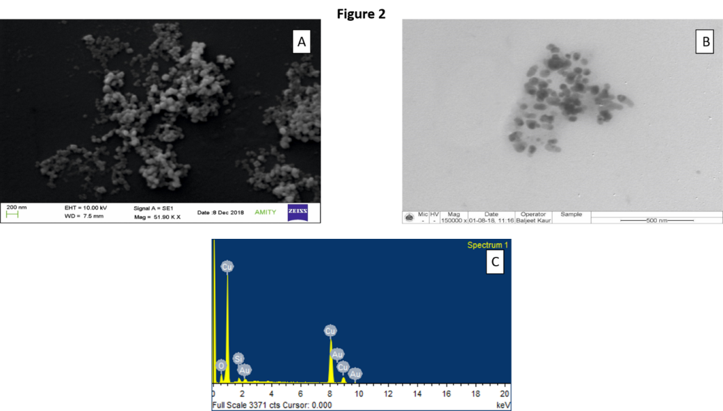 Fig. 2: (A) SEM of CNPs showing particle size of less than 100 nm. (B) TEM of CNPs showing particle size less than 100 nm. (C) EDX of CNPs indicating the presence of copper in CNPs