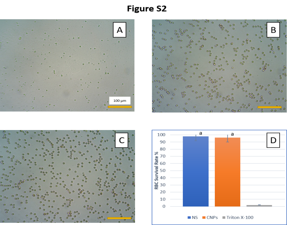 The biocompatibility of CNPs was studied using the Hemagglutinin assay. About one ml of fresh blood was collated from animals and centrifuged at 5488 RCF (4 ⁰C, 10 min). Supernatant was discarded, and the pallet was resuspended in 60 ml of normal saline. One ml the prepared solution was added (1:1) to STD (Triton X-100) and CNPs sample and incubated at 37 ⁰C for 1 hr. Smear of Normal Saline (normal control; NC), triton X-100 (Positive control; PC) and, CNPs samples were observed under optical microscope [22].